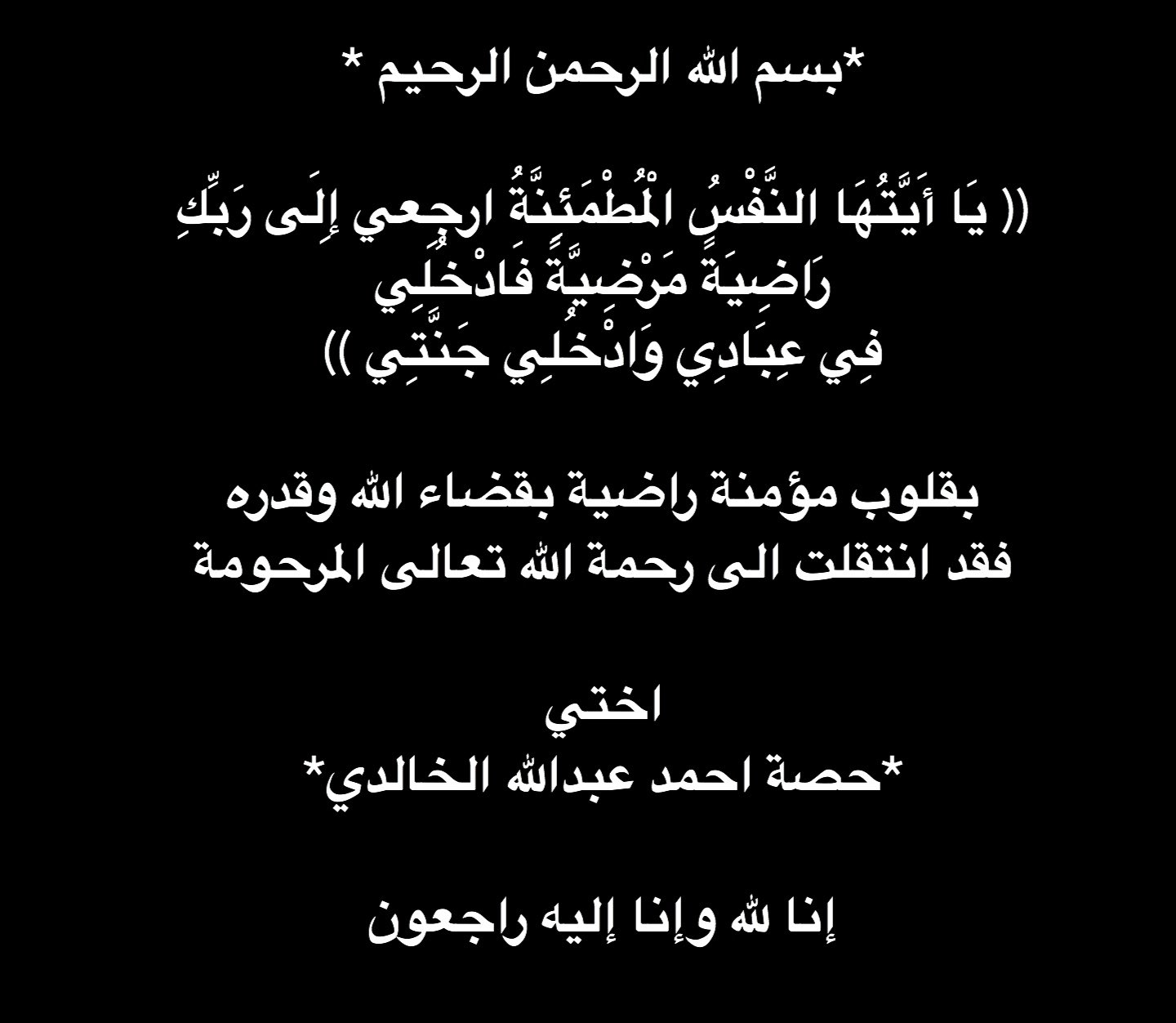 Khaled Alkhaledi خالد الخالدي On Twitter بسم الله الرحمن الرحيم ي ا أ ي ت ه ا الن ف س ال م ط م ئ ن ة ارج عي إ ل ى ر ب ك ر اض ي ة م ر ض ي ة ف اد خ ل ي ف ي ع ب اد ي و اد خ ل ي ج ن ت ي بقلوب مؤمنة راضية بقضاء الله وقدره فقد انتقلت